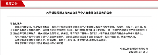 根据公告,工行提醒无持仓、无库存、无欠款、保证金账户仍有资金余额的客户,尽快自助办理资金转出手续。该行将自12月19日起,将上述客户的保证金账户余额批量转出至该业务绑定的结算账户,并关闭相关业务功能。关闭后,客户与工行签署的《代理个人客户贵金属竞价交易业务协议书》将终止。